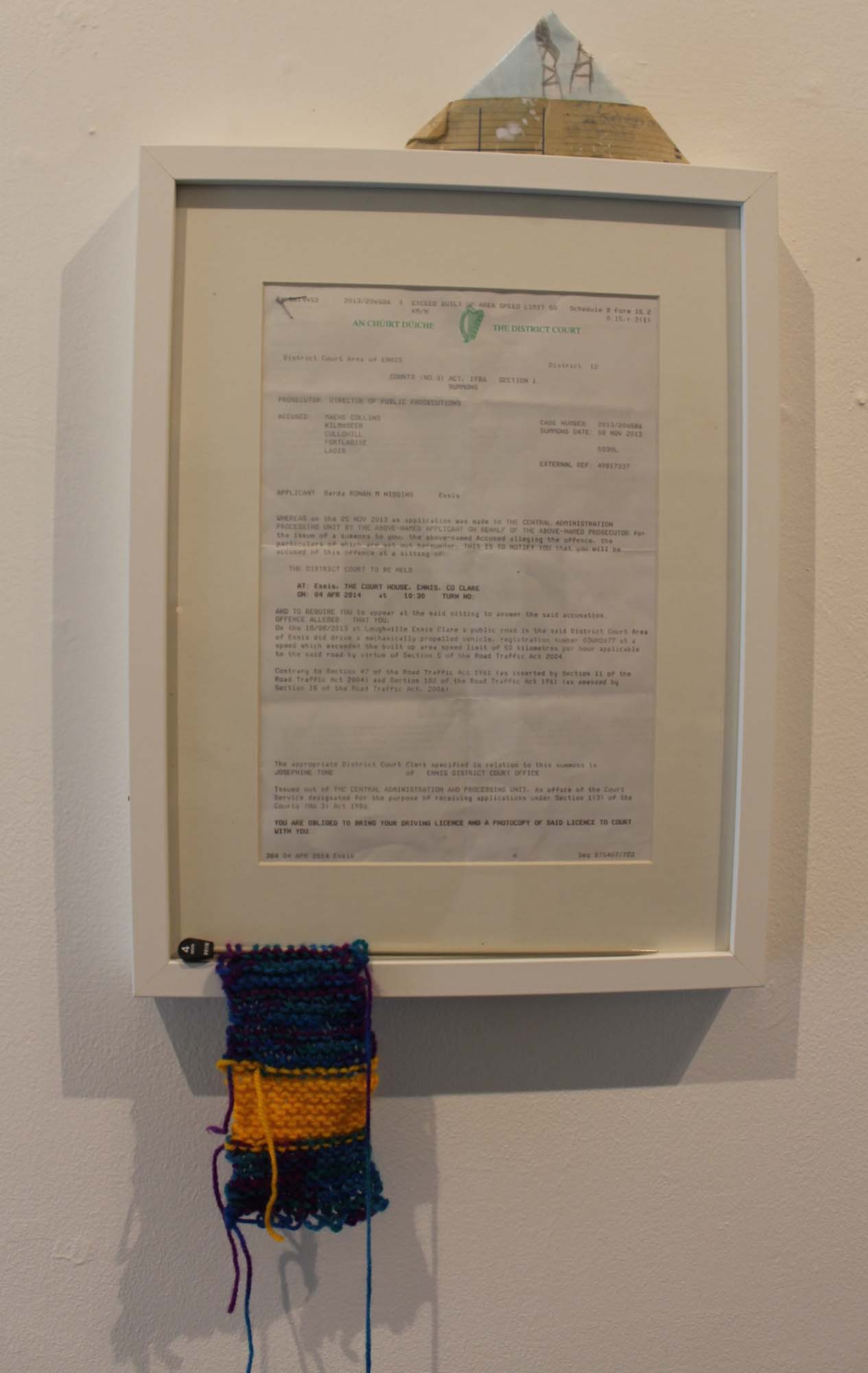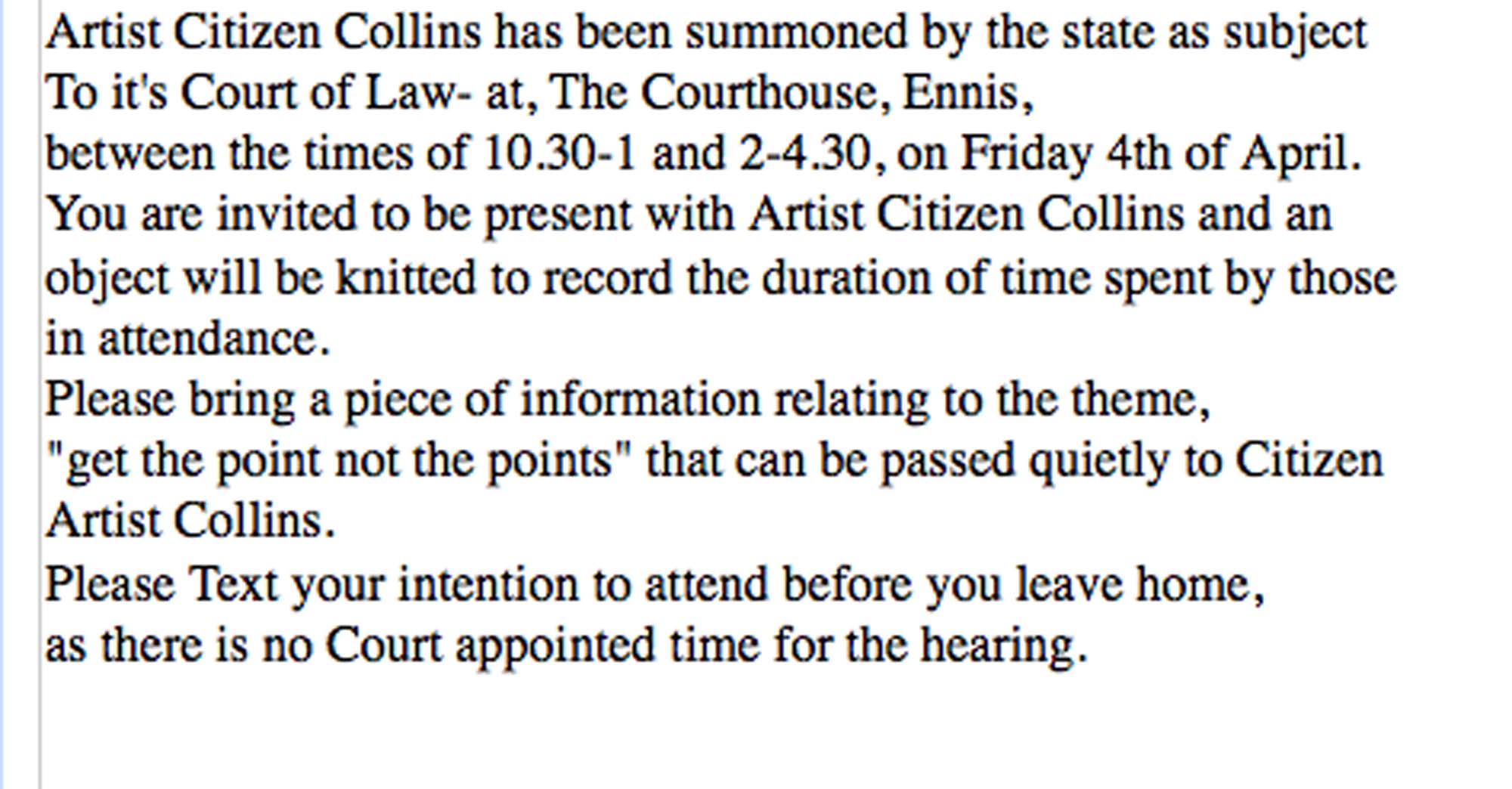 Empathy + Error began as an invitation to friends and acquaintances to join Maeve Collins, as ‘Citizen’ artist, in Ennis District Courthouse, where she was representing herself for an unpaid traffic fine. (Ironically, the notice had never reached me.)