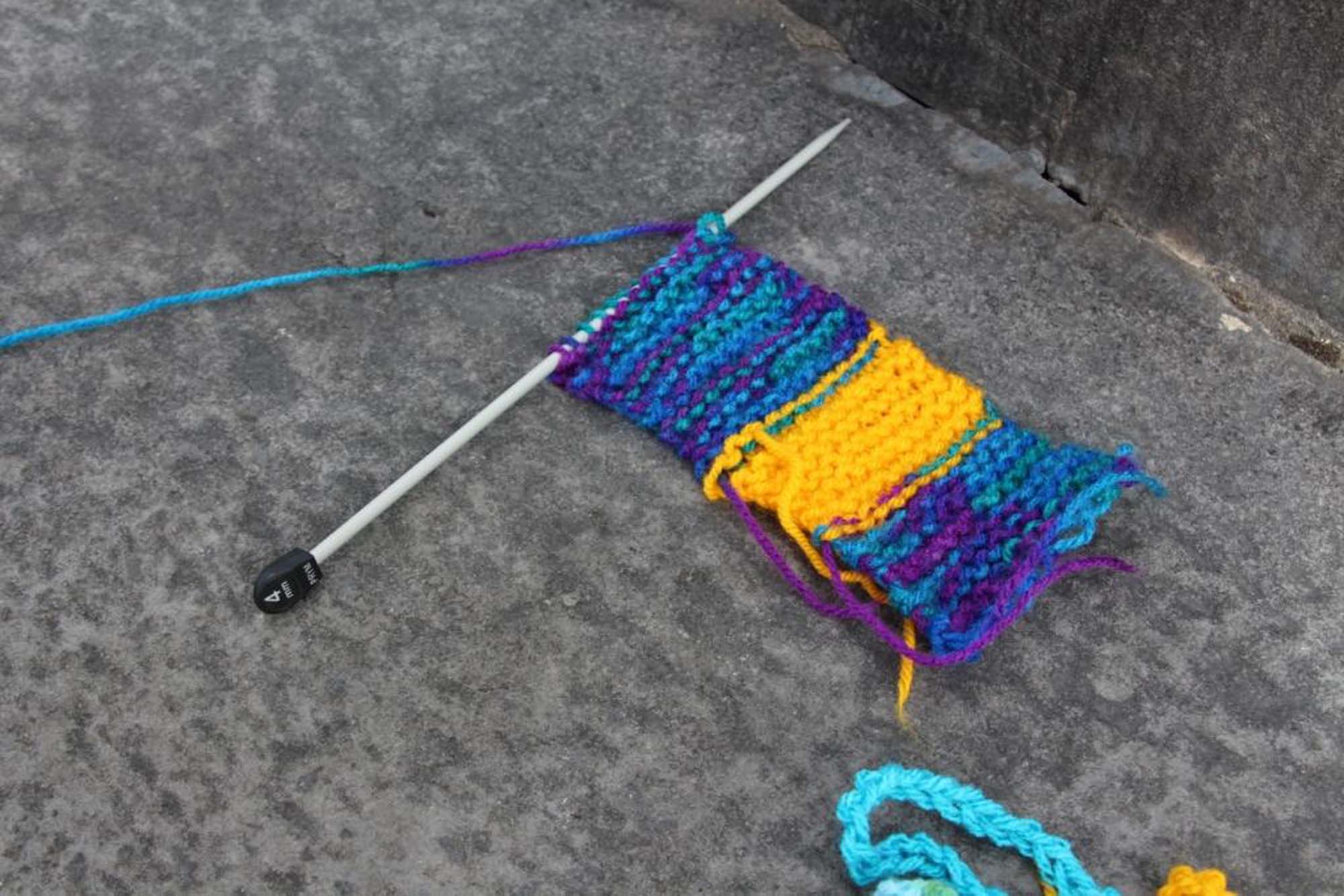 The intervention used knitting as a way to hold presence. Each row recorded the duration of companionship, shifting threads and colours marked the comings and goings of those who stood with me. An object grew in real time from collective attention and care.