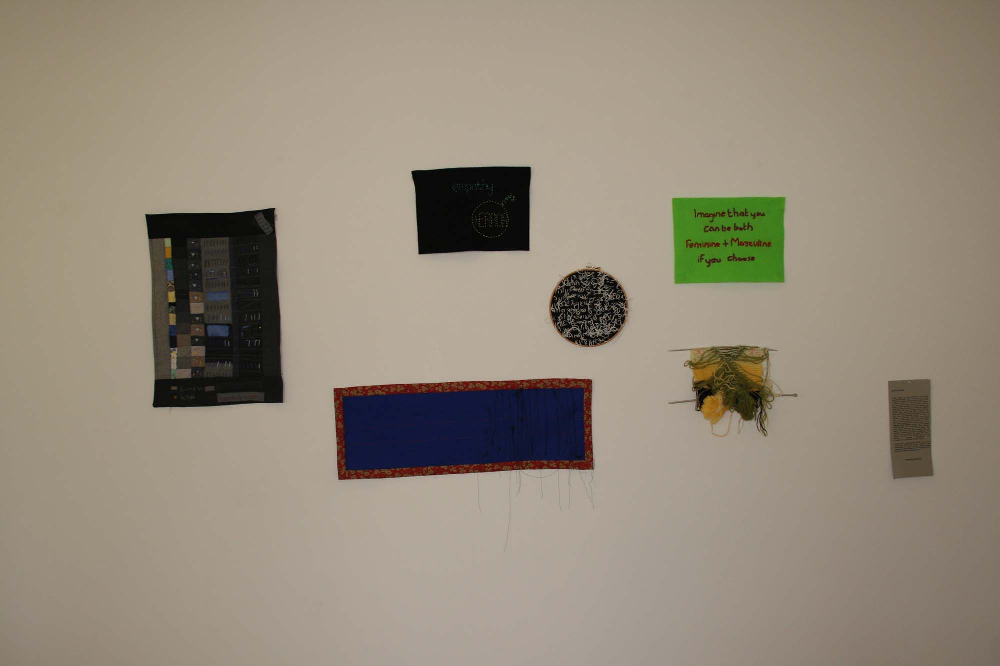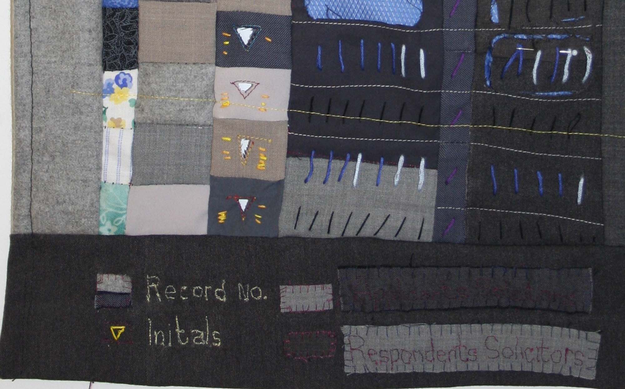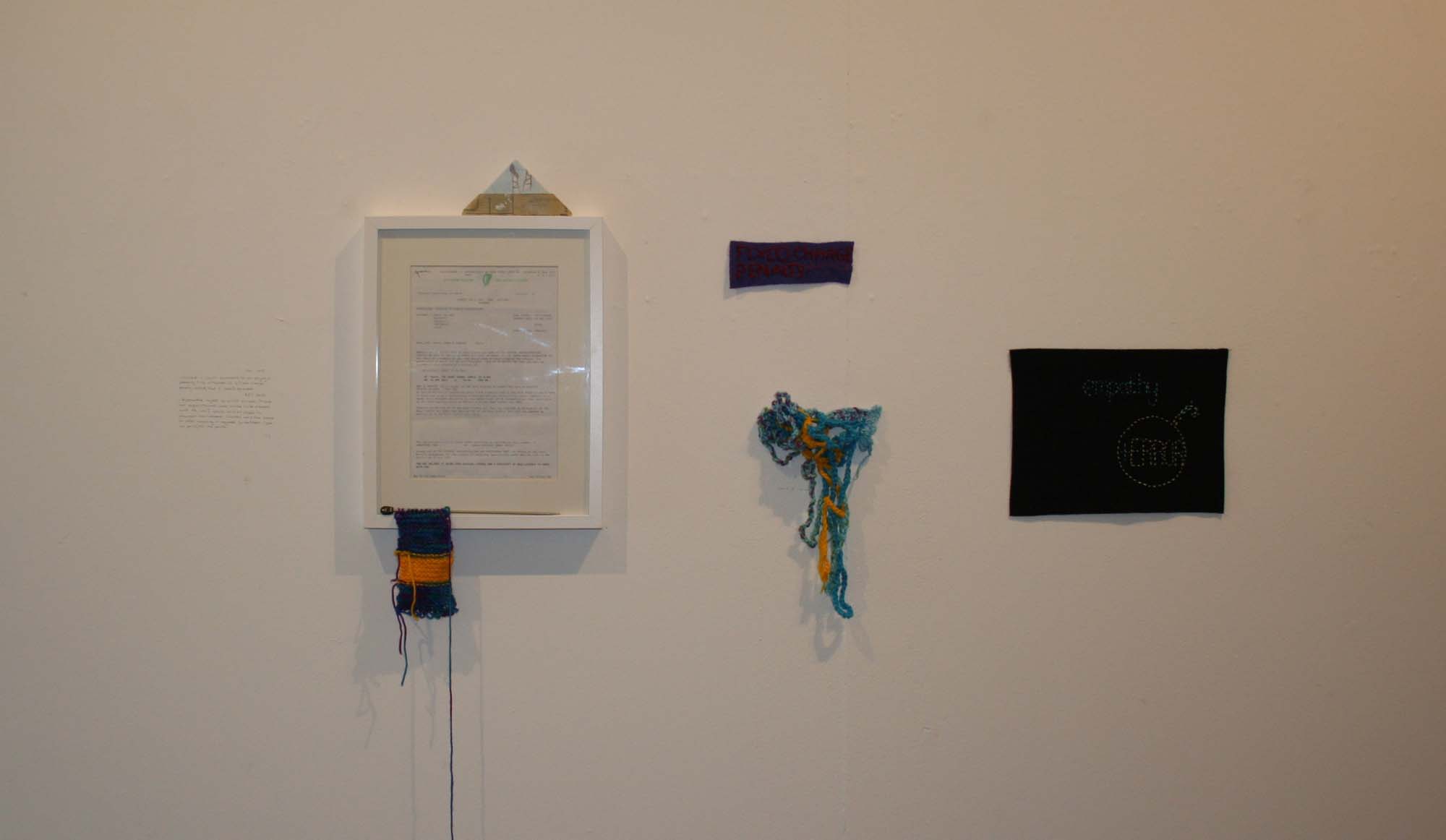 Hand-stitched court documents and artefacts from Empathy + Error have been exhibited in group exhibitions in Ireland, at Post Gallery, Kaunas in Lithuania, and at Enderhousen Gallery in the Netherlands.