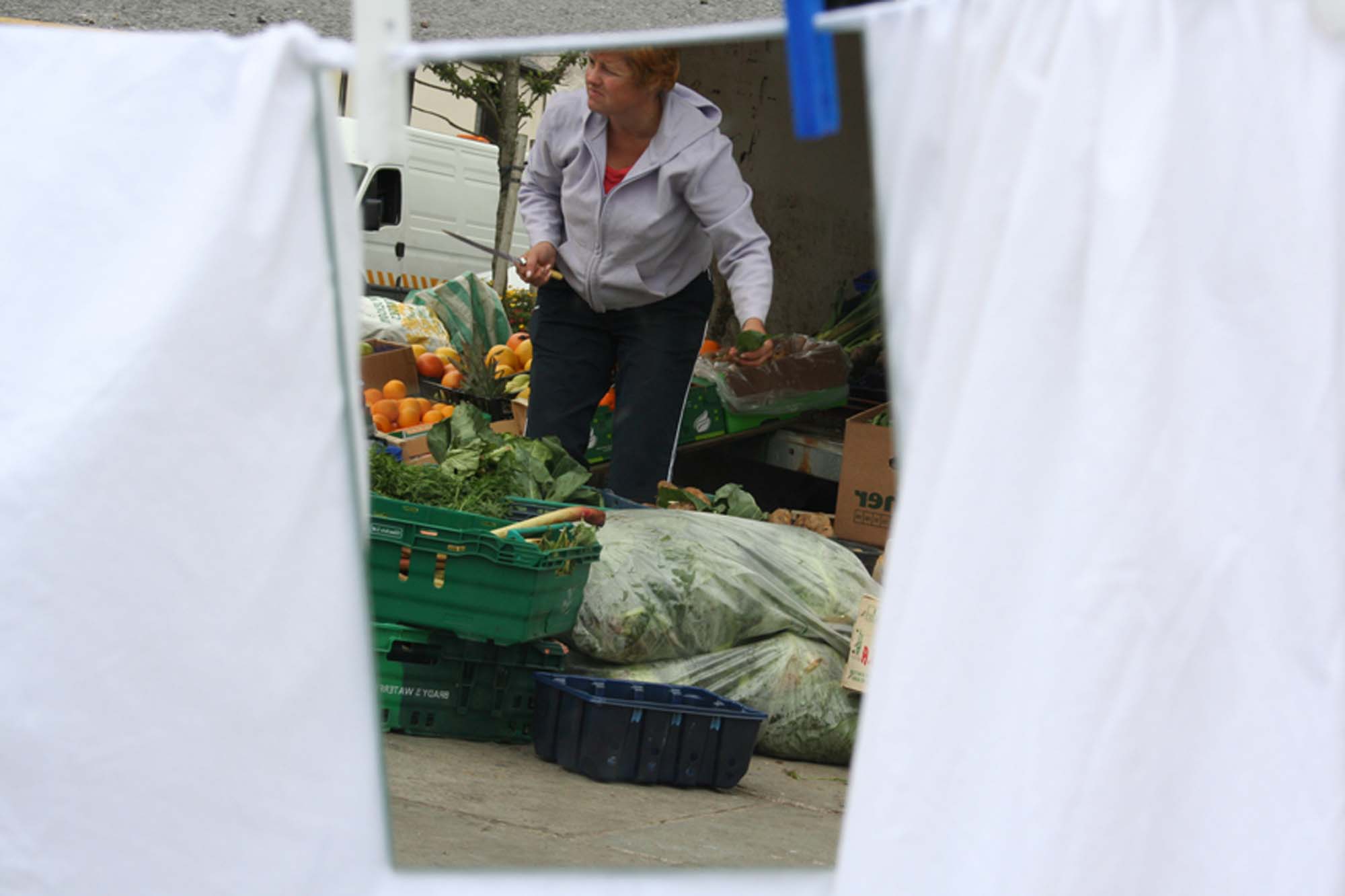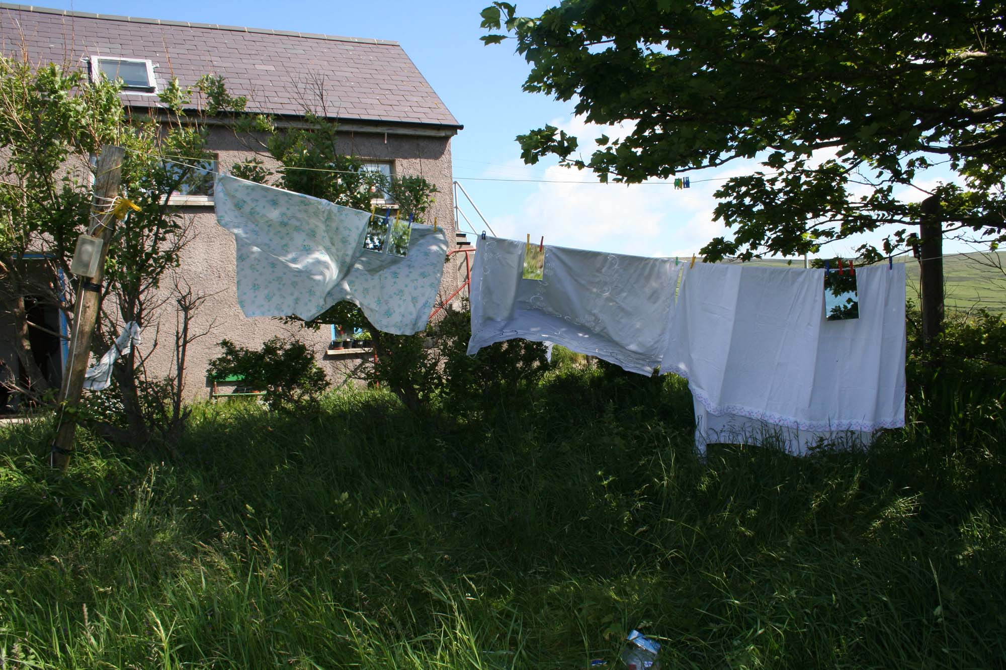 In Ennistymon, the same themes took a domestic form. Each morning for two weeks, Collins strung a washing line across the town square, hanging sheets and mirrors that caught the passing light. Named Sídh, the Irish word for fairy mound, threshold to the Otherworld — the piece blurred the space between public and private, daily life and myth. The wind moved the sheets; mirrors flashed fragments of faces and clouds. The act of looking became an encounter: fleeting, reflective, alive.