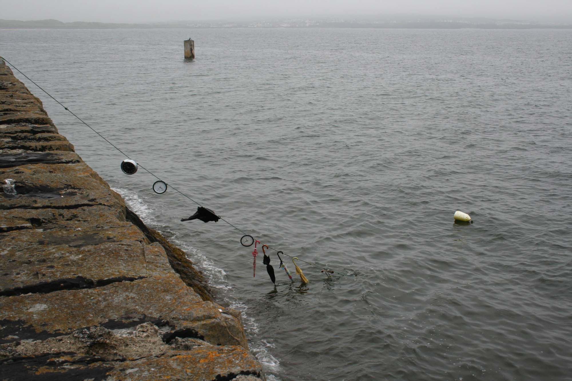 From the ferry routes, the line extended to Liscannor Bay, where Collins installed a rope between the pier and the tide, hung with found objects — a black dress, an umbrella, a pair of green shoes, a fiddle, mops and brushes, and several clocks. The work, titled Contemporary Hy Brasil, was a meditation on disappearance and return. As the tide rose and fell, the visible length of rope- an umbilical thread to the unseen island of Hybrasil or Cill Stephane – changed; the seaweed gathered; the clocks stopped. Some objects vanished, some drifted back. The work, left to the ocean became an offering, a letting go.