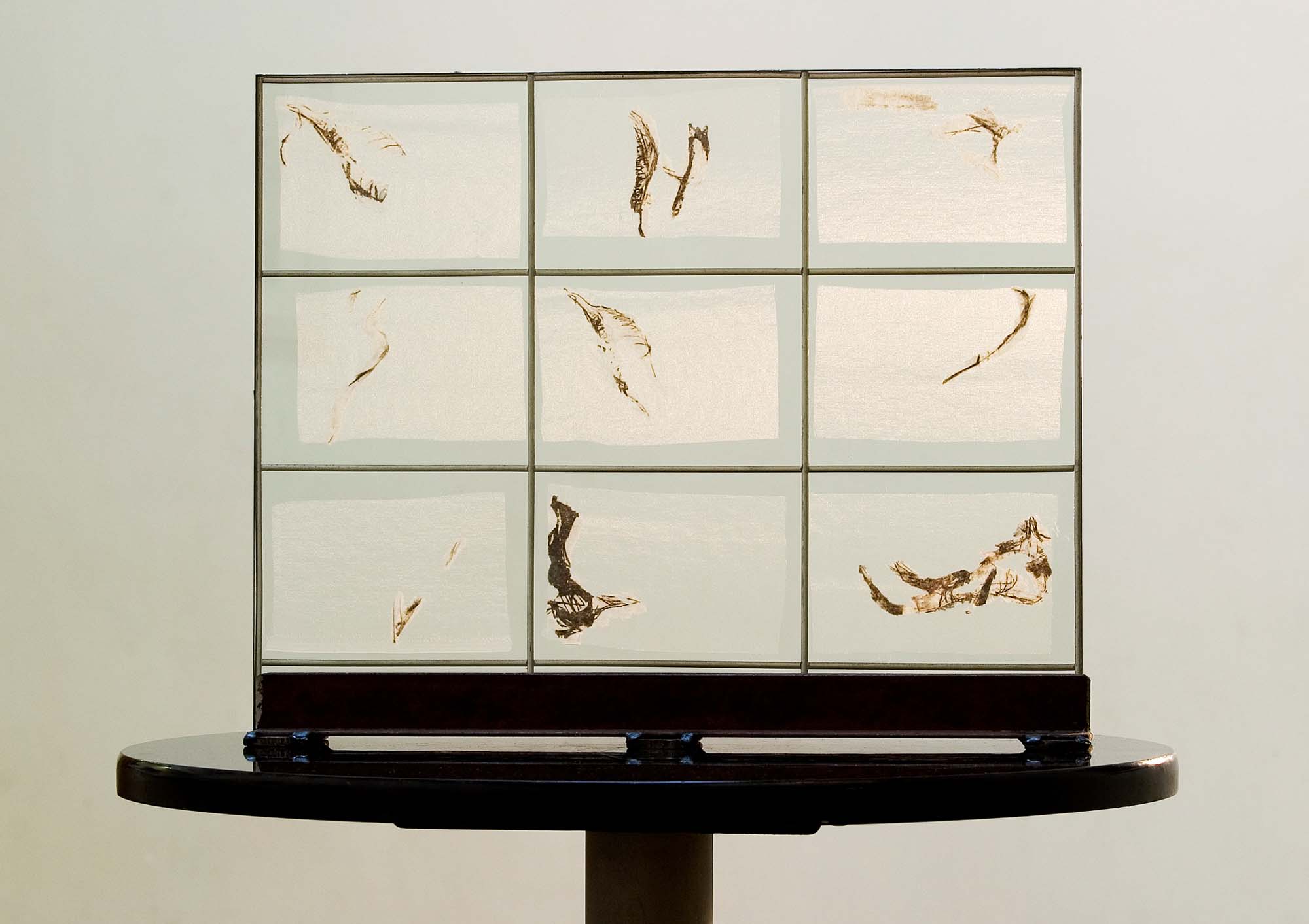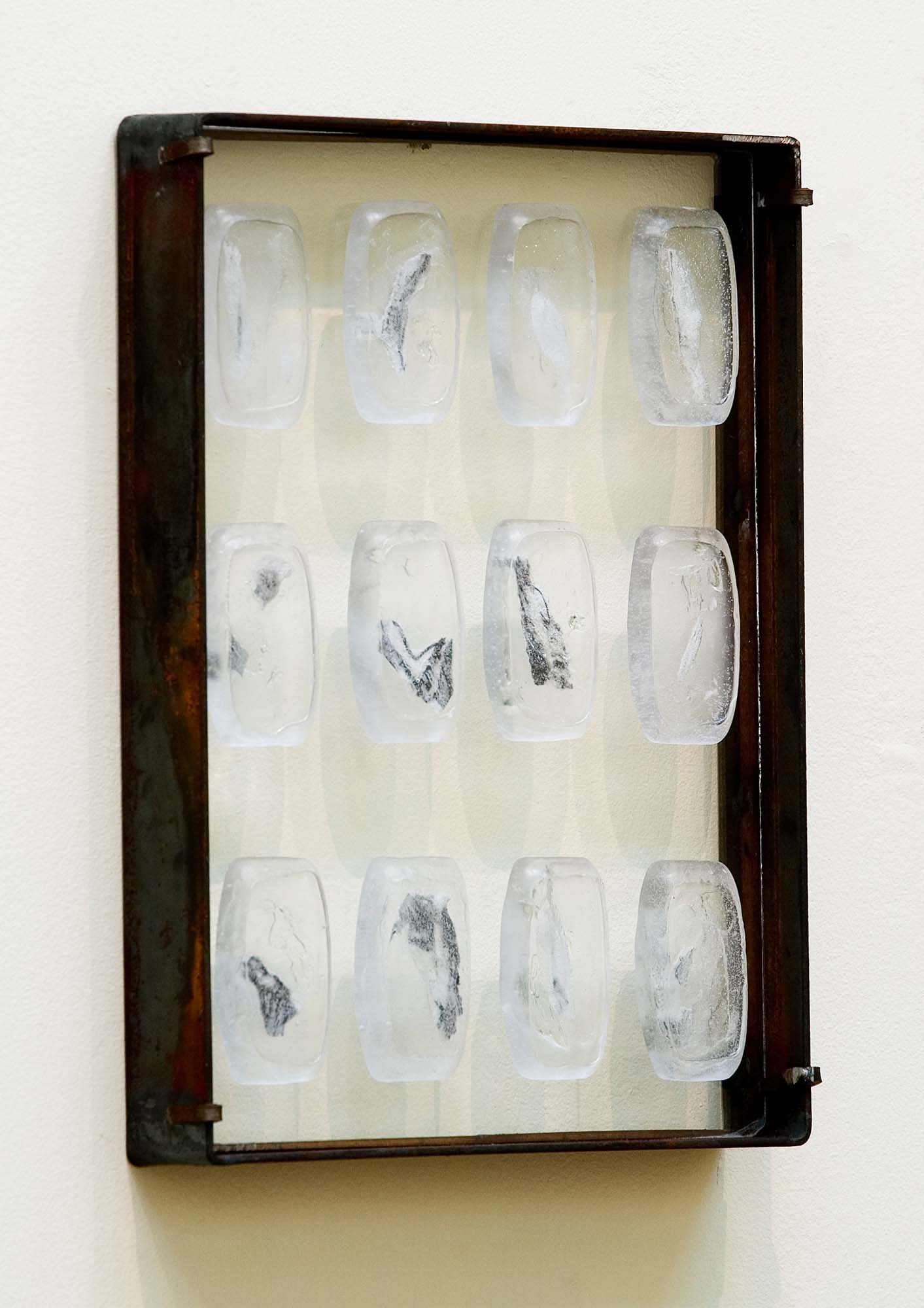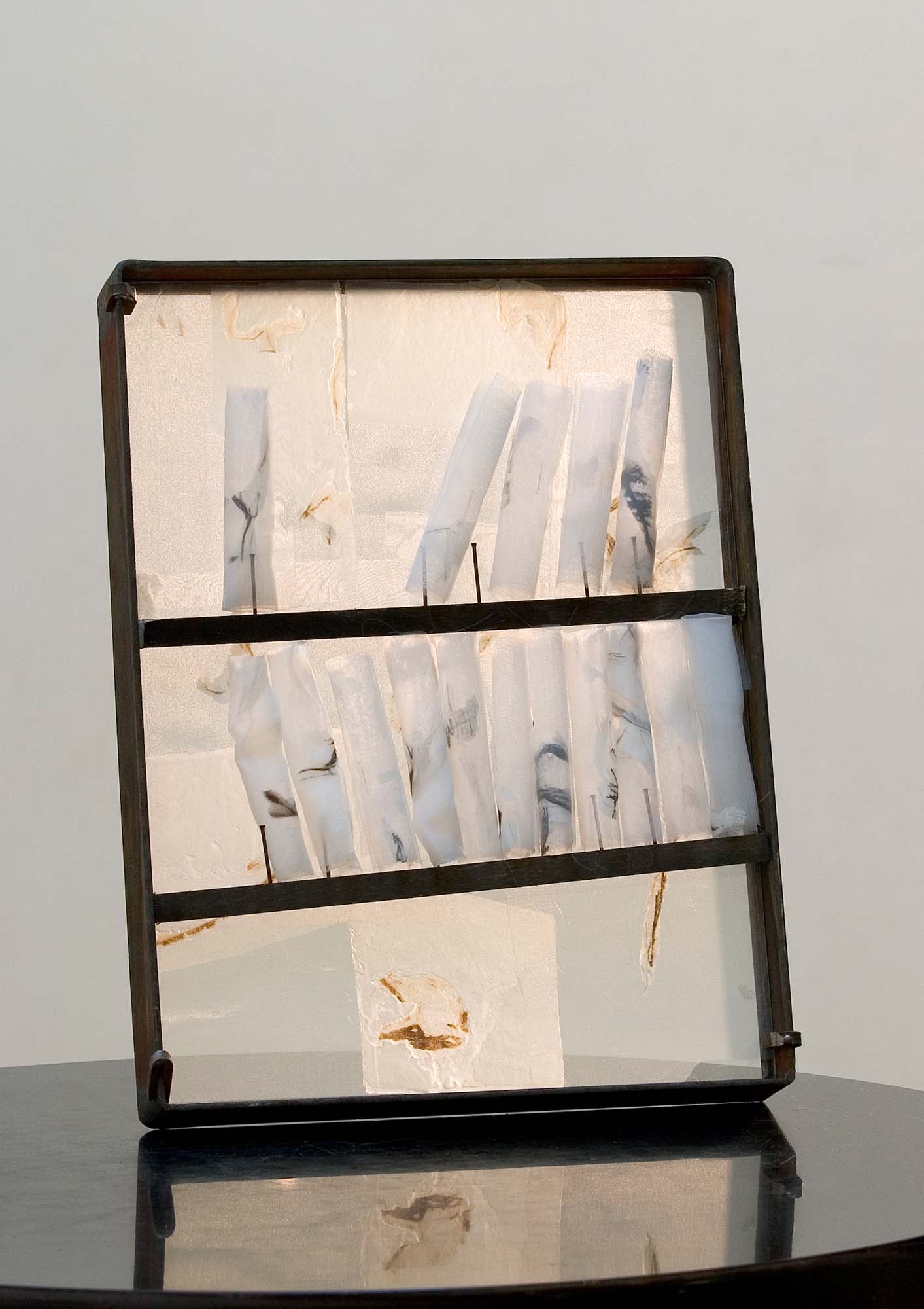 Steel, glass, drawing on voile, clear casting resin