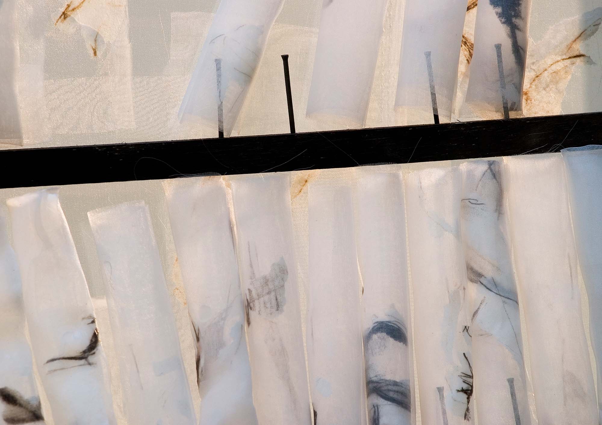 An installation of layered materials and drawn lines suggesting the continual transformation between sensual, emotional, and mental states of the body.
