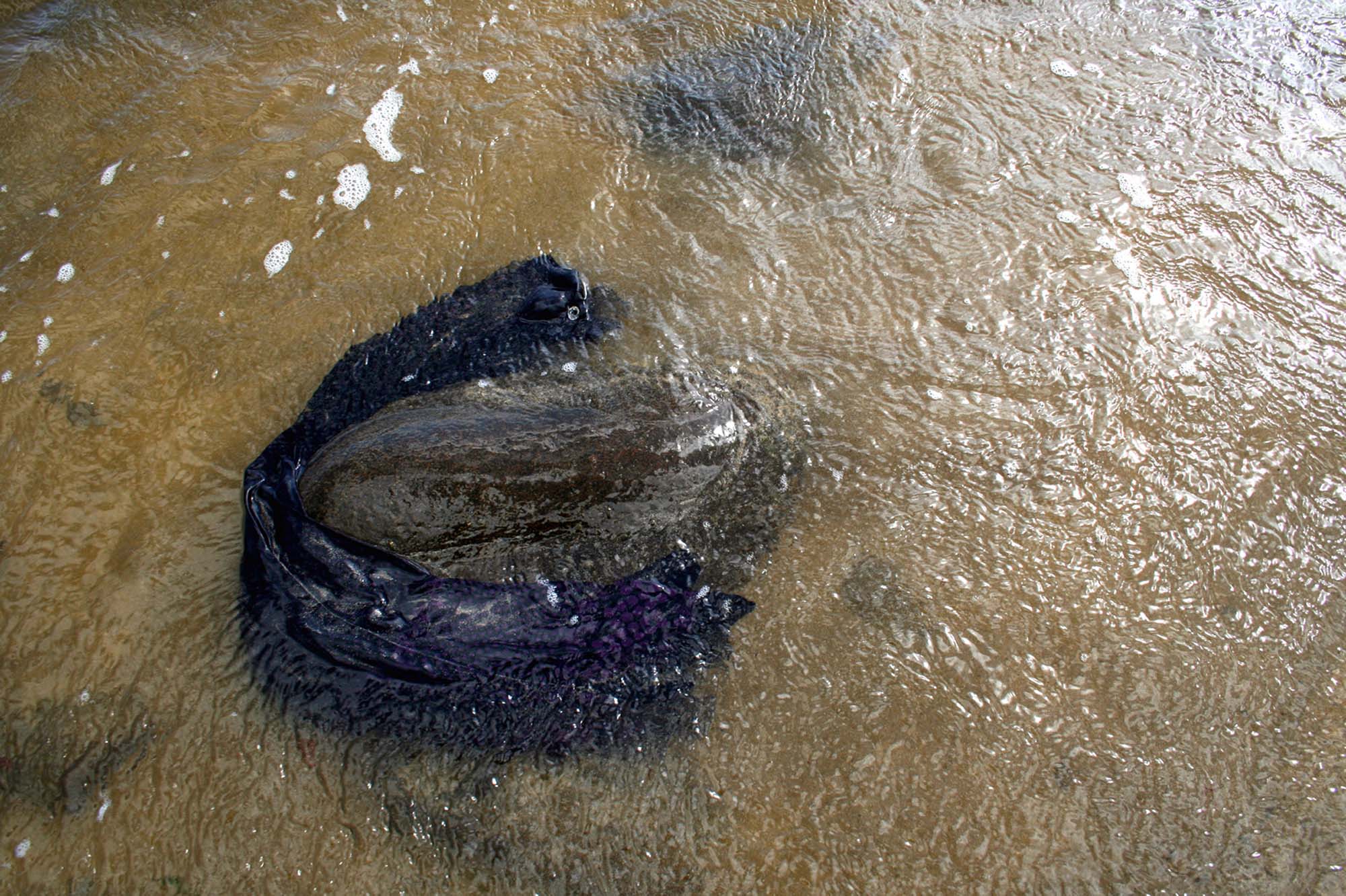 In dress, soaked in luxury Collins placed a dress into the sea, allowing the currents to shape and fold it while capturing its movement through photography. The resulting images including three successive photographs showing the dress wrapping around a rock, document the delicate tension between surrender and retrieval, human intervention and natural movement. These works are also entitled i ndochas dhomhain (deepest down), emphasizing depth, presence, and the subtleties of interaction with the sea.